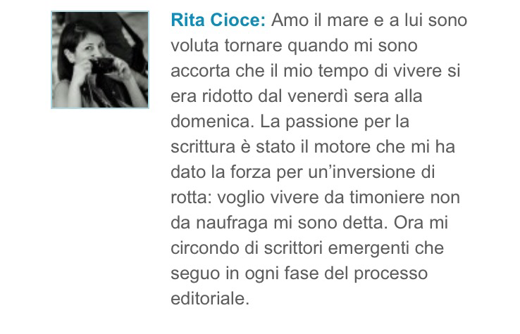 Voglio condivedere con voi la storia della mia editor Rita Cioce, la sua carica, il suo modo d’essere mi hanno dato la spinta giusta a voler inseguire i miei sogni.